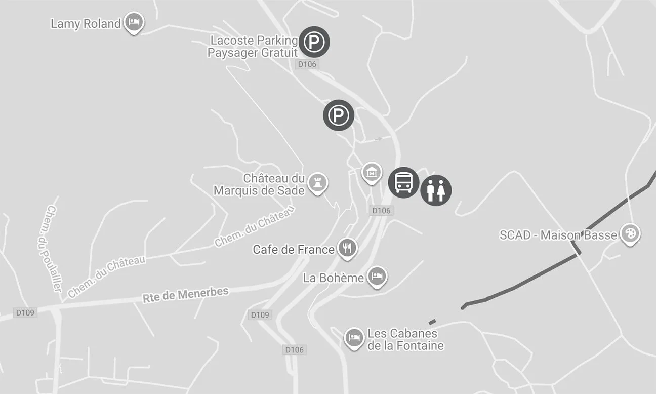Easily accessed by car, the main road, the D106, provides direct access from the N100. Avignon is about 50 kilometers away by road. As part of a day trip from Avignon, my sister and I made the drive to Lacoste in about an hour and found the drive very easy and mostly scenic once outside of Avignon, with free parking in the car park, Parking Paysager, located on the Route d'Apt at the entrance to the old medieval center. You may find additional parking along the road on the D106 as you enter the village and around the bend, shortly after passing the Cafe de France.